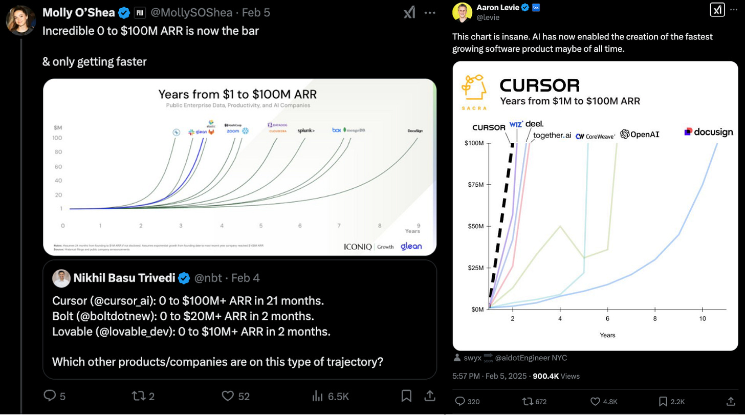 Last week Cursor, Deel, and Glean reenergized the X timeline with a spoonful of pure tech SaaS ARR Founder Mode energy. AI-driven products, marketing, and teams are collectively proving to hit an inflection point in this once-shaky AI economy, moving up standard expectations of growth to rapid, hyper-conversion.. and this might just change the game for VC strategies. If you’re not embracing AI in your tech & ops stacks, you’re left in the dust. Must find cracked AI-driven teams early.