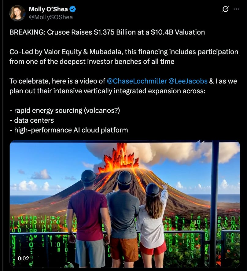 - Crusoe Energy, a Denver-based modular data center company, held a first close on what it says will be nearly a $1.4b Series E round at a valuation north of $10b. Valor Equity Partners and Mubadala Capital are leading, with participation from Altimeter Capital, BAM Elevate, Fidelity, Founders Fund, and Blue Owl Capital.