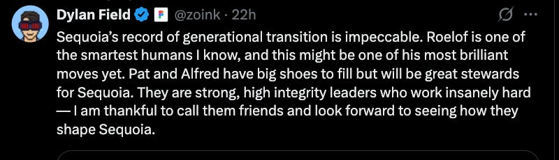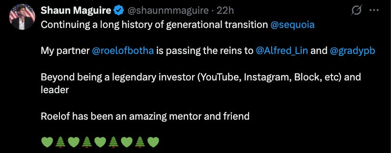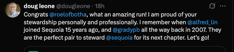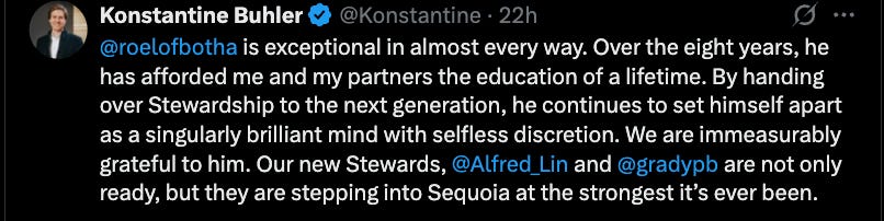 Roelof Botha announced yesterday that Alfred Lin and Pat Grady are becoming the new stewards (leaders) of Sequoia. This marks the latest generational transition in the firm’s 53-year history, continuing its tradition of passing leadership when the next generation is ready.
