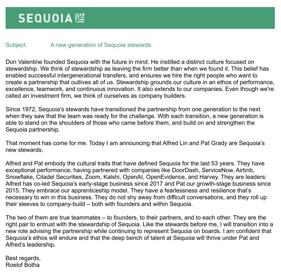 Roelof Botha himself will transition to an advisory role while continuing to represent Sequoia on company boards.