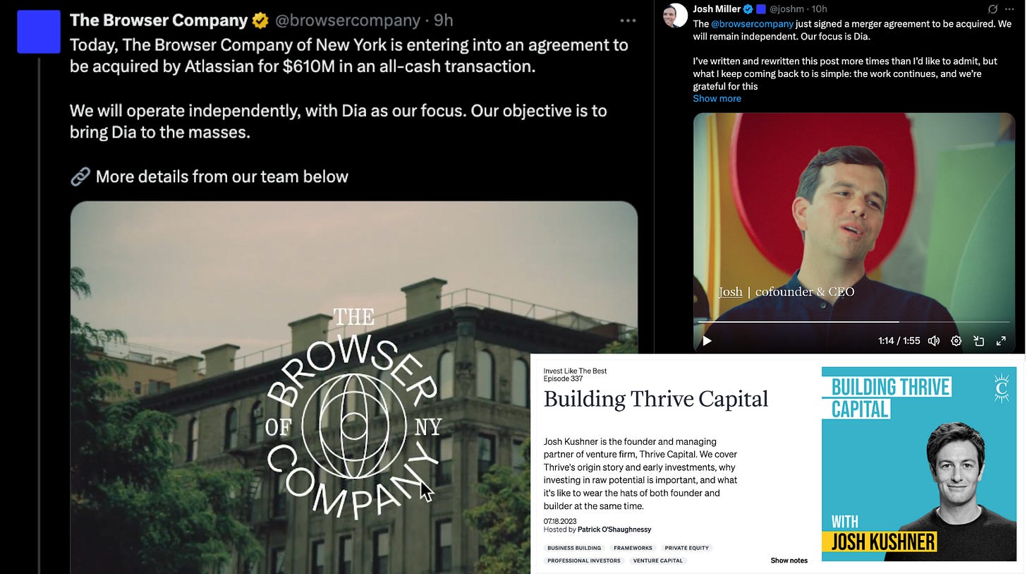 This matters because Thrive’s pattern has been to spot ambitious consumer-tech and productivity plays early (Instagram, Spotify, OpenAI), and Arc/Dia’s trajectory fits neatly into that lineage. The acquisition validates Thrive’s incubation strategy while giving Atlassian a product with strong cultural resonance among early adopters.