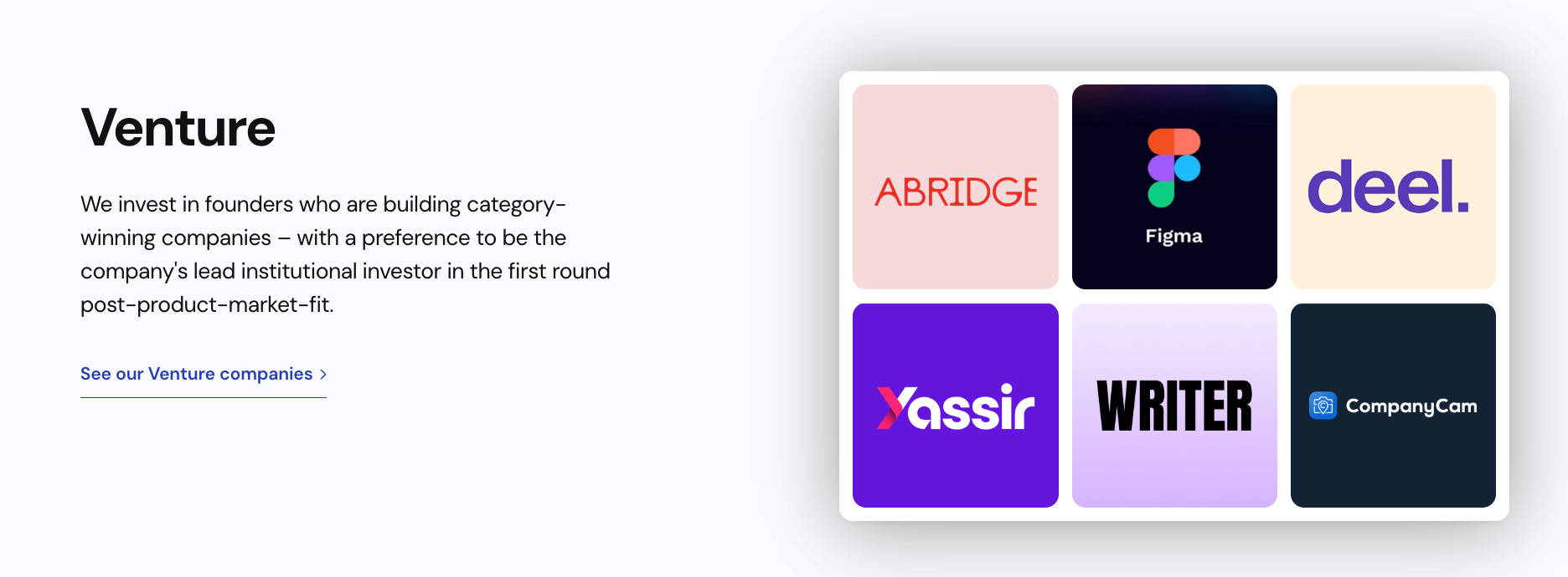 Venture: typical check sizes of $5–15 million, focused on generational founders rather than ownership targets