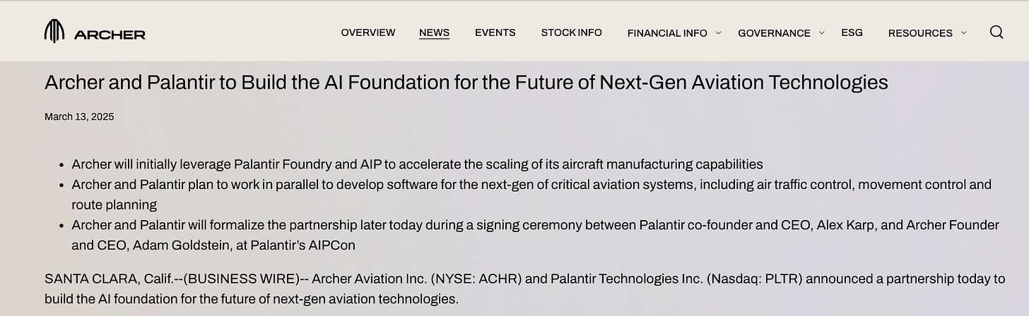 Archer also partners with Palantir on data & AI infrastructure, applying Palantir’s platforms to manufacturing, operations, & complex system coordination across next-generation aviation.