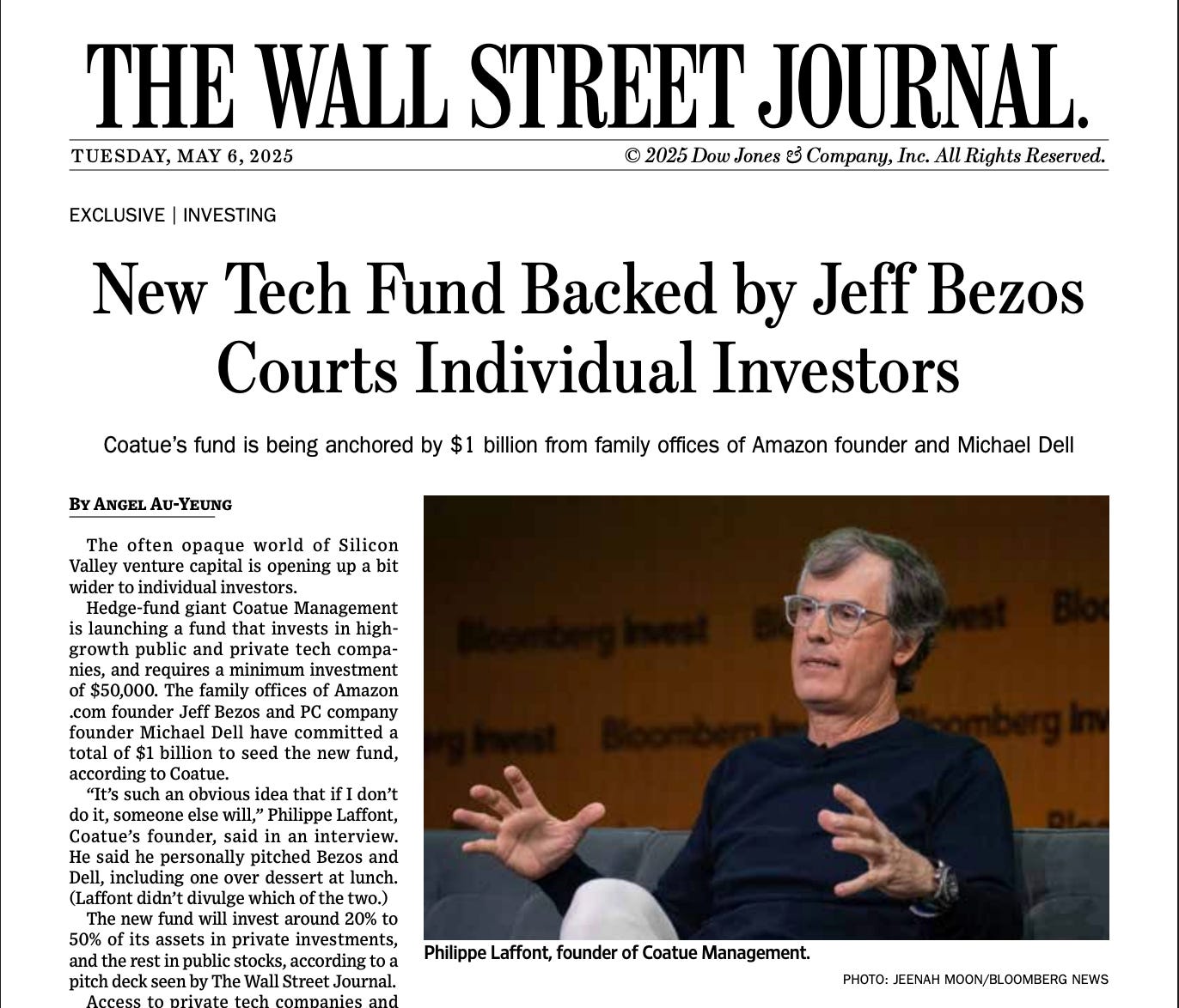 “It’s such an obvious idea that if I don’t do it, someone else will,” Philippe Laffont, Coatue’s founder, said in an interview. He said he personally pitched Bezos and Dell, including one over dessert at lunch. (Laffont didn’t divulge which of the two.)