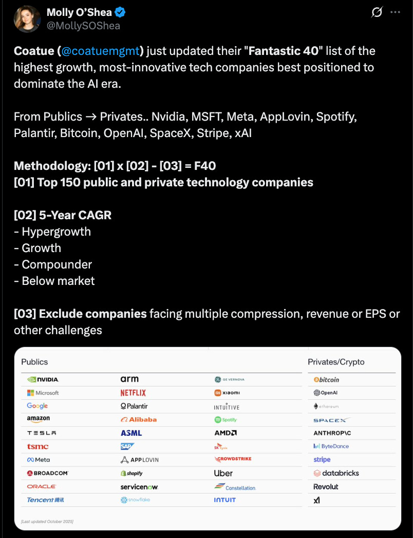 To benchmark performance, the firm also publishes its Fantastic 40, a quarterly ranking of the fastest-growing companies across public and private markets—a framework that helps investors spot emerging leaders before they’re obvious.