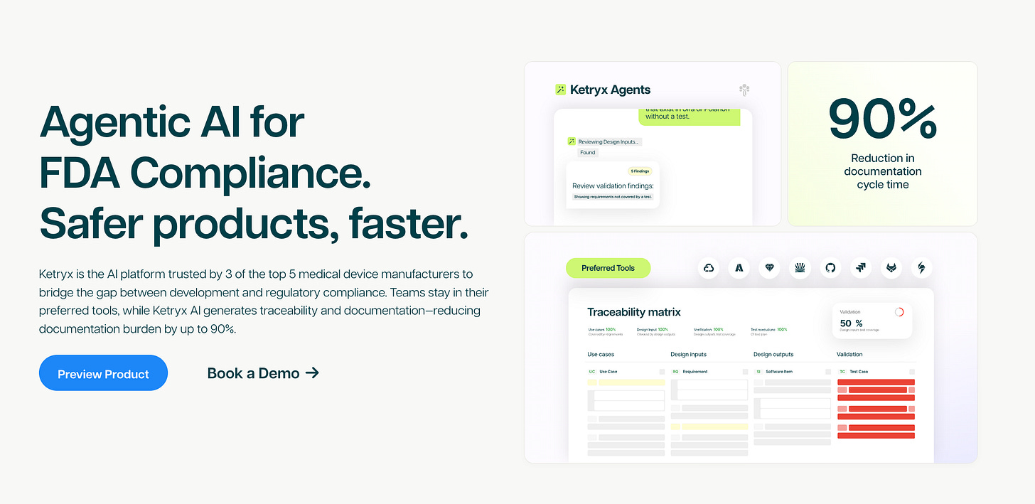 Ketryx already counts three of the top five global MedTech companies as customers. Products built on Ketryx accounted for 2–3% of FDA software approvals in 2024, validating the company’s impact in a short time.