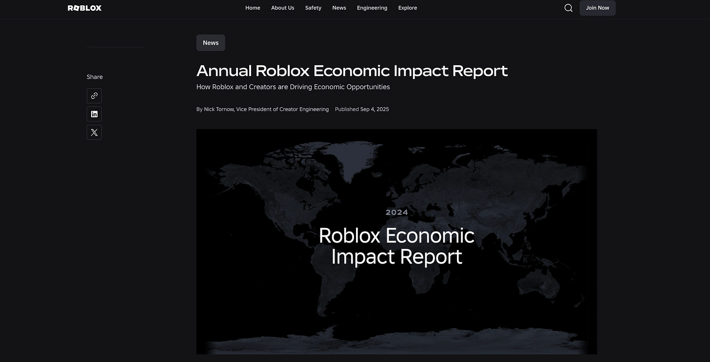 Roblox’s economic footprint extends beyond the platform. Between 2017 and 2024, it contributed an estimated 22,000 full-time job equivalents and $1.62 billion in GDP to the U.S. economy, with creators generating approximately $416 million in tax revenue. In 2024 alone, Roblox drove $445 million in GDP impact, up 29% year-over-year.