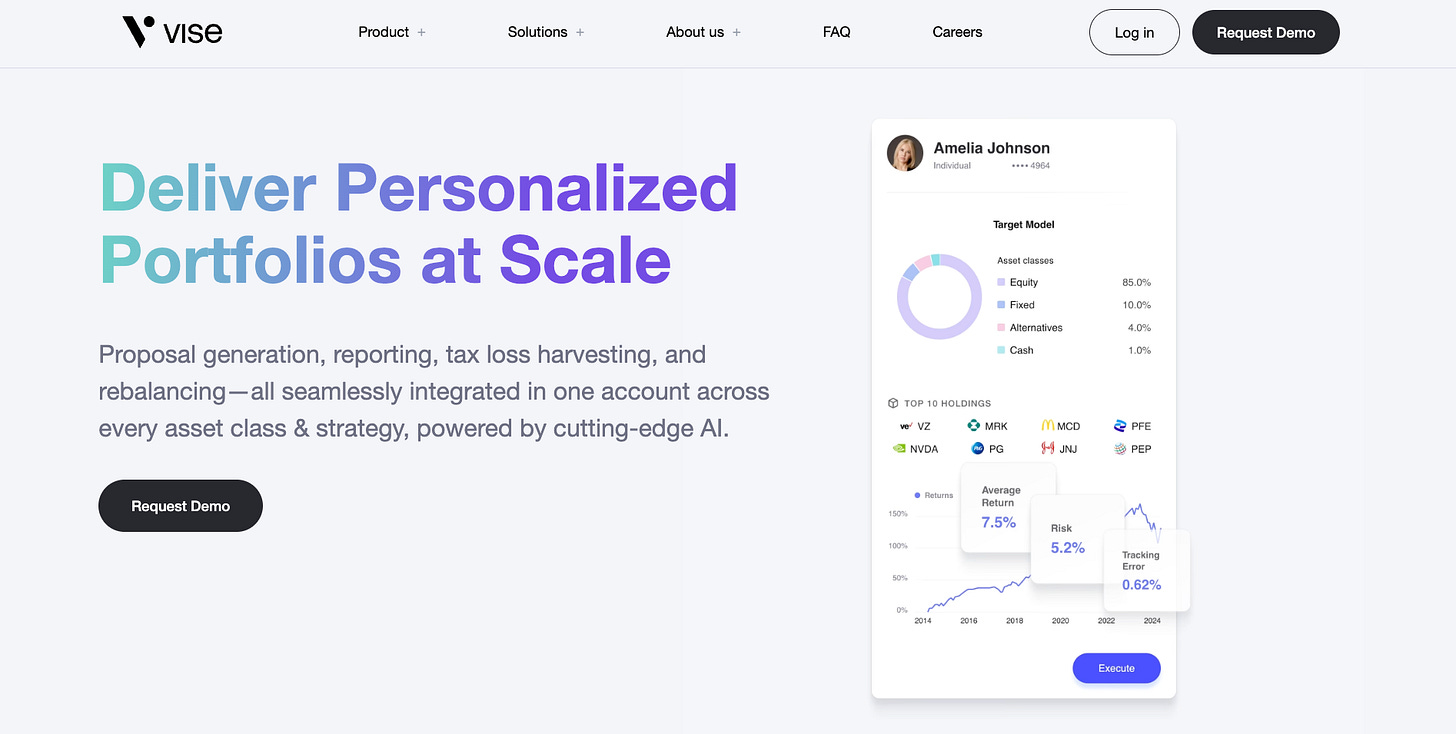 Vise not only builds these portfolios but actively trades and optimizes them for tax efficiency, risk, and long-term goals. “We’re aspiring to build... a total portfolio solution.”