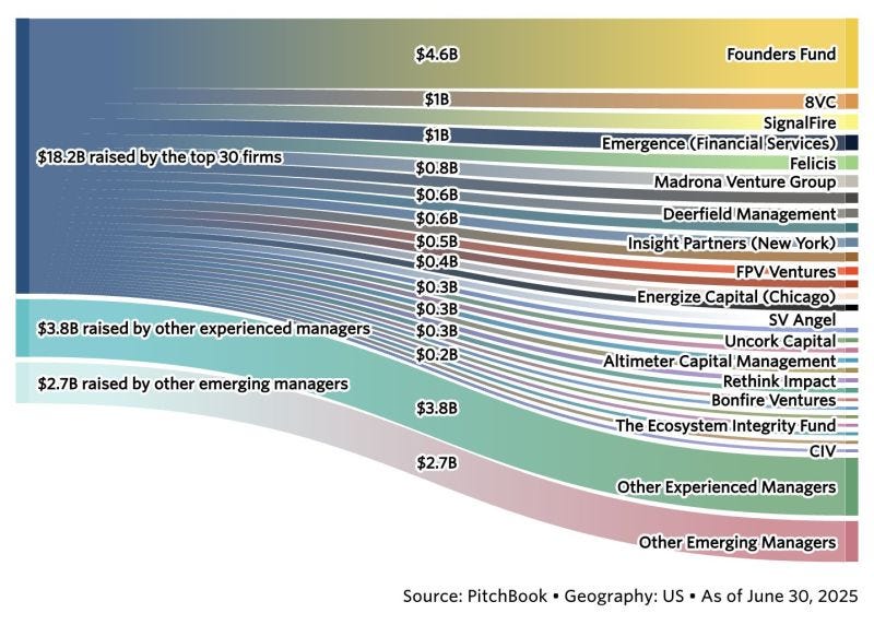➤ On the LP side: 50%+ of LP dollars this year have gone to 12 firms. Last year, 74% of LP dollars went to 30 firms.
