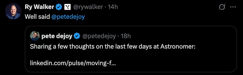 If you’re looking for real-time reporting, look no further than Co-Founder & former CEO of Astronomer, Ry Walker (now CEO of Tembo - ai agents for eng teams)