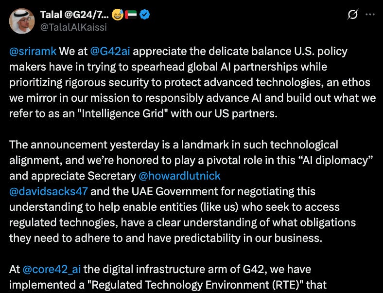 Following support by Sriram Krishnan, Senior Policy Advisor for AI at the White House, on the U.S.–Middle East AI partnerships, G42 Executive Talal Al Kaissi shared the "Regulated Technology Environment (RTE)"—a framework the UAE is using to ensure secure collaboration on AI infrastructure. Emphasizing that safeguarding U.S. technologies is not new to G42, pointing to the landmark 2024 Intergovernmental Assurance Agreement (IGAA) between Microsoft and G42. Announced alongside Microsoft’s $1.5 billion investment, the IGAA established a first-of-its-kind security and compliance architecture for cross-border AI deployments. Co-developed with U.S. and UAE government input, the agreement enforces stringent controls around export compliance, national security, AI safety, and model governance.