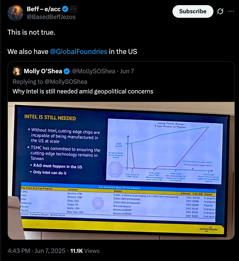 Of note, GlobalFoundries Inc. (Nasdaq: GFS) was left out of Dylan’s talk because of their focus away from leading-edge scaling law chips, like the ones TSMC, Samsung, & Intel offer. GFS remains a U.S.-headquartered semiconductor foundry serving critical industries such as automotive, aerospace, defense, industrial, RF, and IoT. GFS has a global manufacturing footprint across the U.S., Europe, & Asia. The company is majority-owned (~81%) by Mubadala Investment Company, the sovereign wealth fund of Abu Dhabi, via its holding arm Mamoura Diversified Global Holding (MDGH).