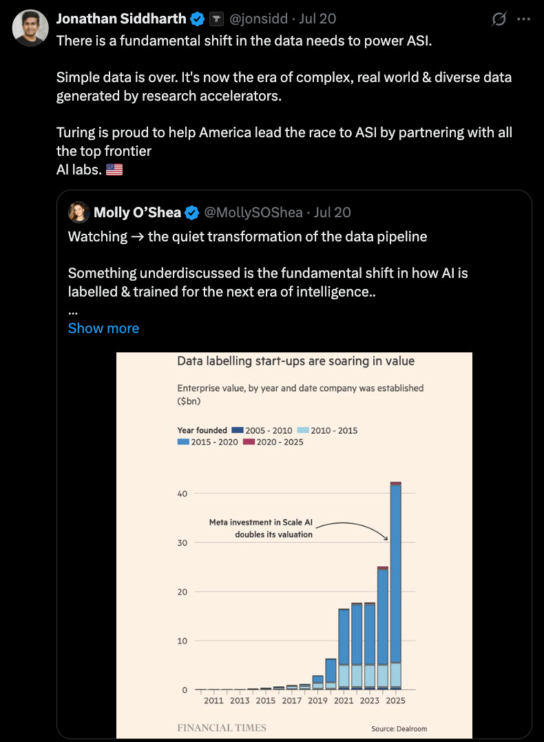 “The era of sweatshop data labeling is over. Now what the labs need is a strategic research accelerator — and Turing is the world’s leading research accelerator, working with all of these frontier labs to advance them.”