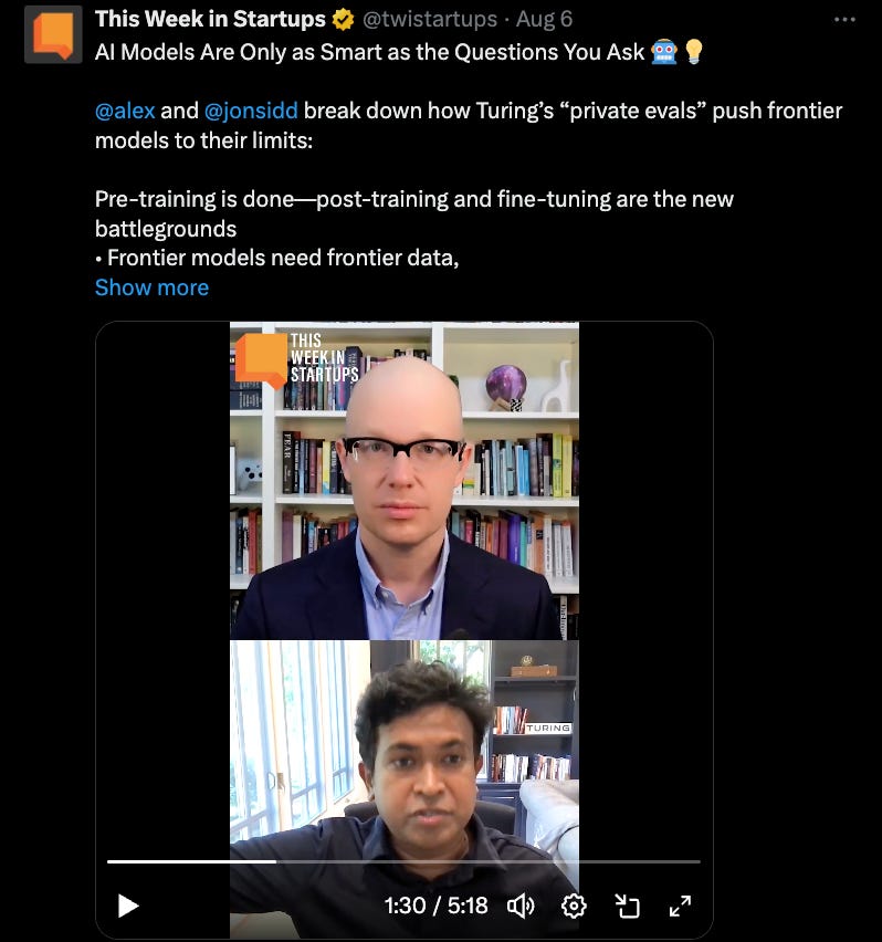 In this conversation we go deep into how models work, the steps to get to GPT-5, and why, despite the results of the MIT AI study, enterprise demand is still skyrocketing. Turing is at the front, helping close that “gap” – a huge opportunity where Fortune 500s in finance, insurance, and pharma are racing to build proprietary intelligence on their own data, creating durable moats in the $30T knowledge work economy.