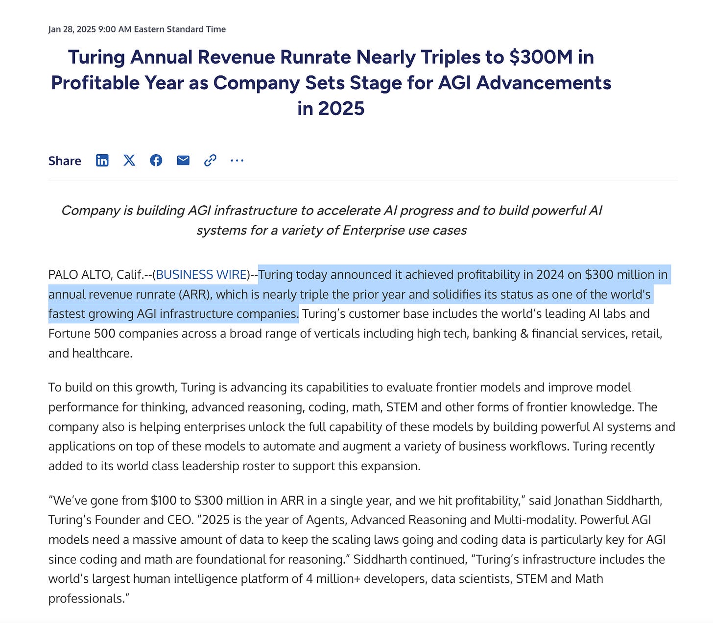 Turing has become a hidden force in the AI race, hitting $300M in ARR in 2024 (~3x YoY), achieving profitability, and raising $111M at a $2.2B valuation in March. That growth cements its position as one of the fastest-growing AGI infrastructure companies. Which brings us to today, with frontier labs like OpenAI, Anthropic, Meta, Google, Microsoft, Nvidia, & Amazon all relying on Turing for frontier data.