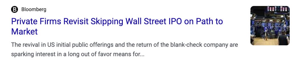 “A select group of high-profile names eventually followed the Spotify formula. Palantir, Coinbase, gaming platform Roblox Inc. and eyeglass retailer Warby Parker Inc., were among the companies that used direct listings in 2020 and 2021 alongside record volumes in the period for both traditional IPOs and alternatives such as SPACs.” Bloomberg