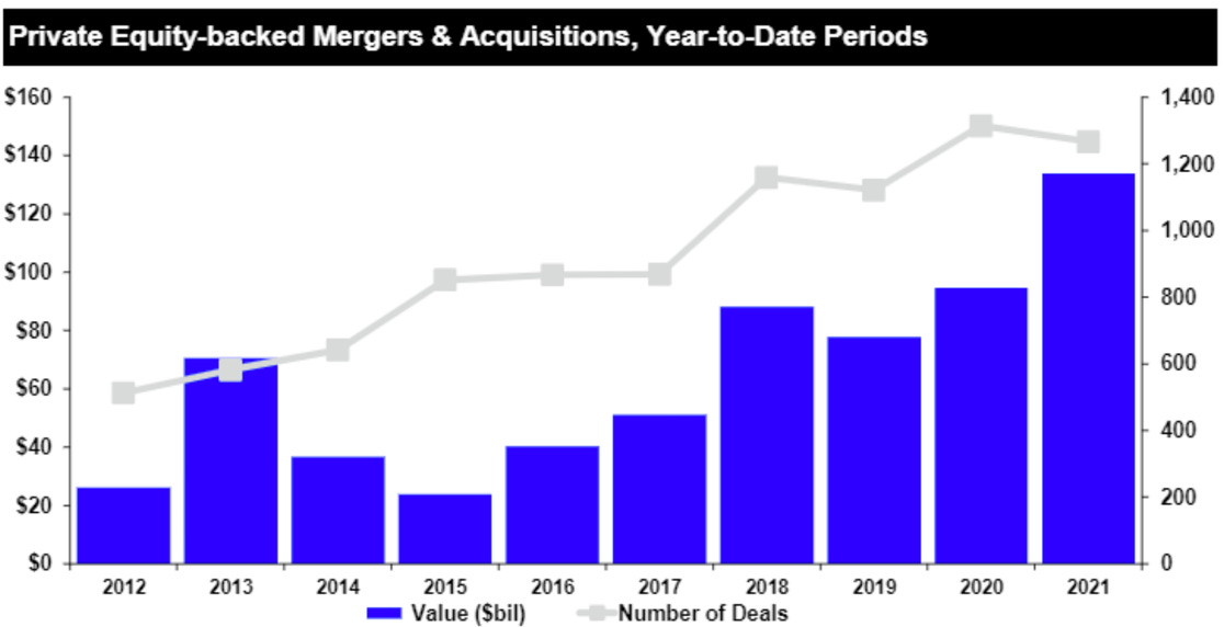 Global private equity volume hit $133.2 billion through last Friday, up 41% year-to-date over 2020, per Refinitiv.