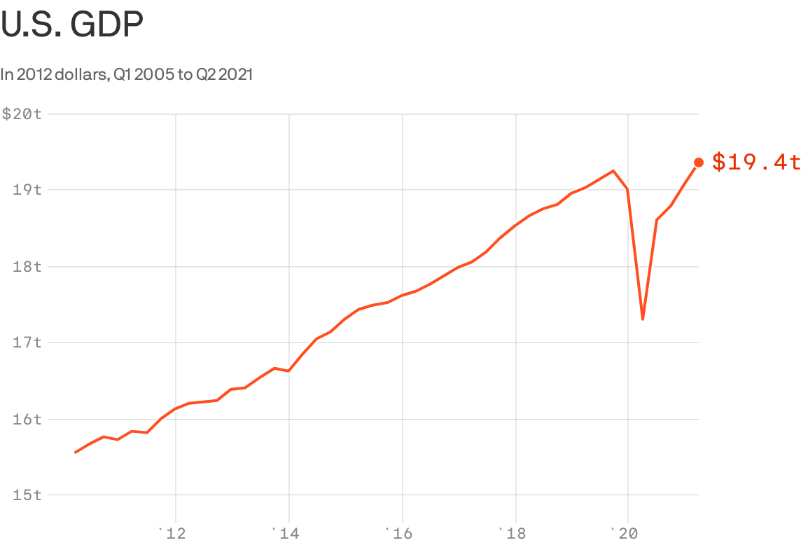 The U.S. economy grew at an annualized 6.5% rate in Q2 2021. It's a tick higher than Q1 GDP, but well below the 8.4% rate that economists expected. Go deeper.