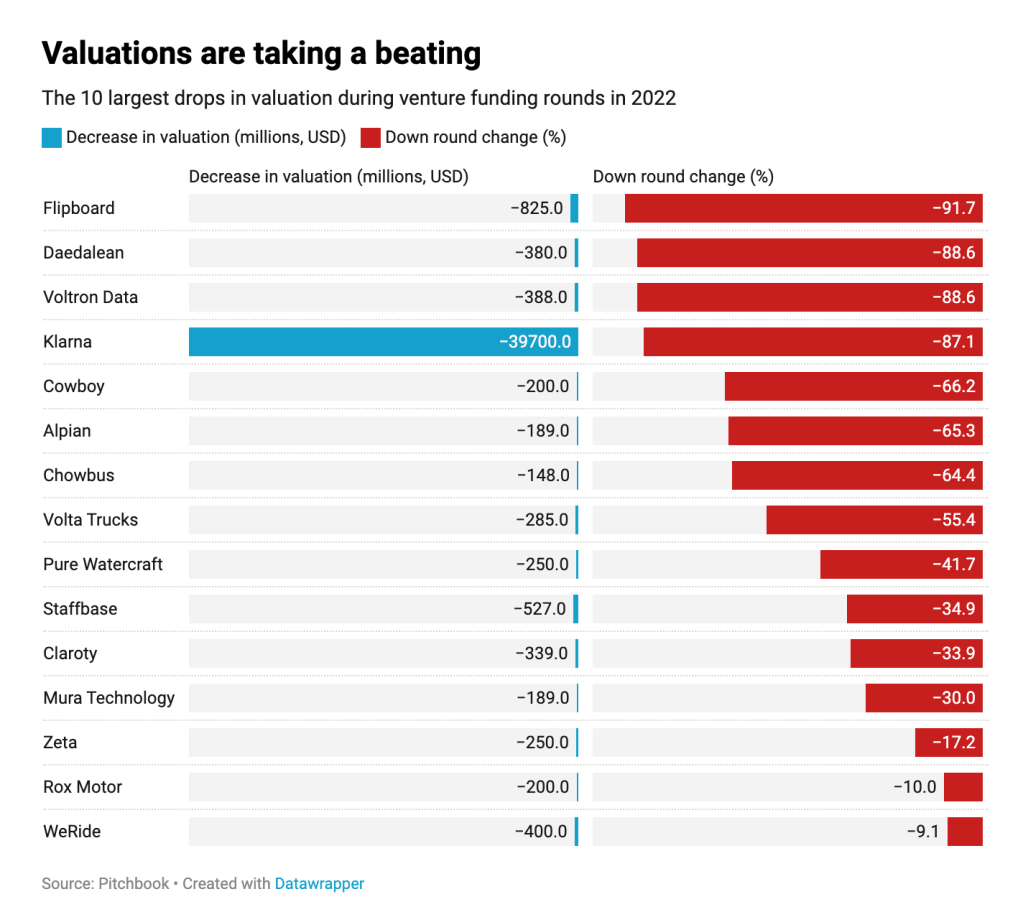 The graph below shows the 15 largest VC markdowns in dollar terms through July 26, ranking the startups according to both percentage and dollar declines.