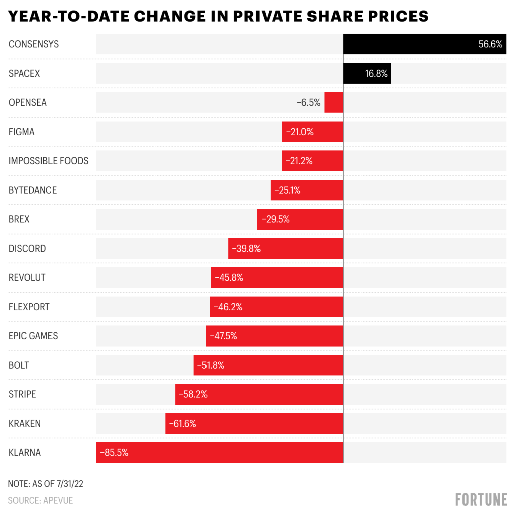 Interestingly, not all companies are having a bad year on the secondary market. Shares of blockchain technology solutions company ConsenSys, which had raised a whopping $450 million in venture funding at a $7.1 billion valuation in March, are trading nearly 57% above what they were at the beginning of this year, per ApeVue data. And shares of Elon Musk’s SpaceX, which is reportedly seeking to raise $1.7 billion in capital, are up 16.8%, according to the data. You can’t say as much for the other 13 most actively traded companies—namely Klarna, Kraken, Stripe, and Bolt.