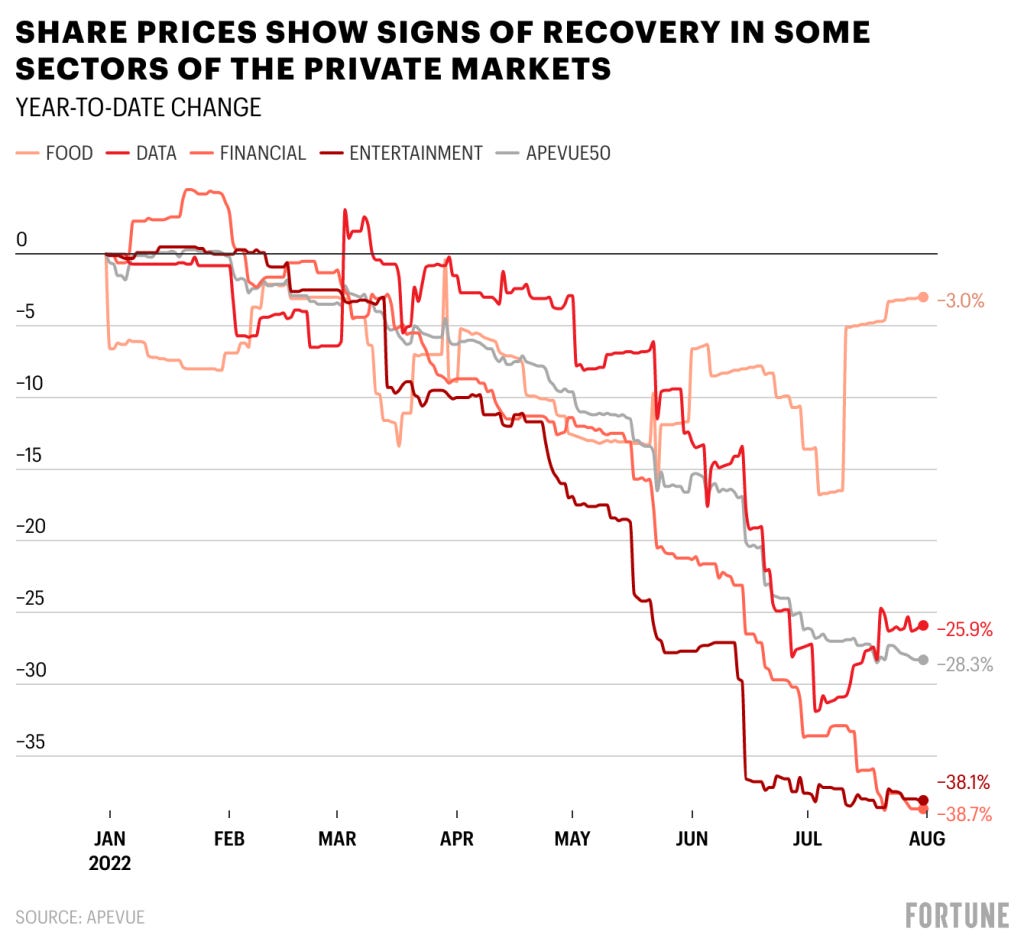 The data isn’t perfect: Not all private companies are actively traded on the secondary market, and ApeVue doesn’t pull share prices on companies where less than $1 million worth of shares are exchanging hands. But it’s still a worthwhile indicator of what things are looking like under the hood, which is this: Still bad.