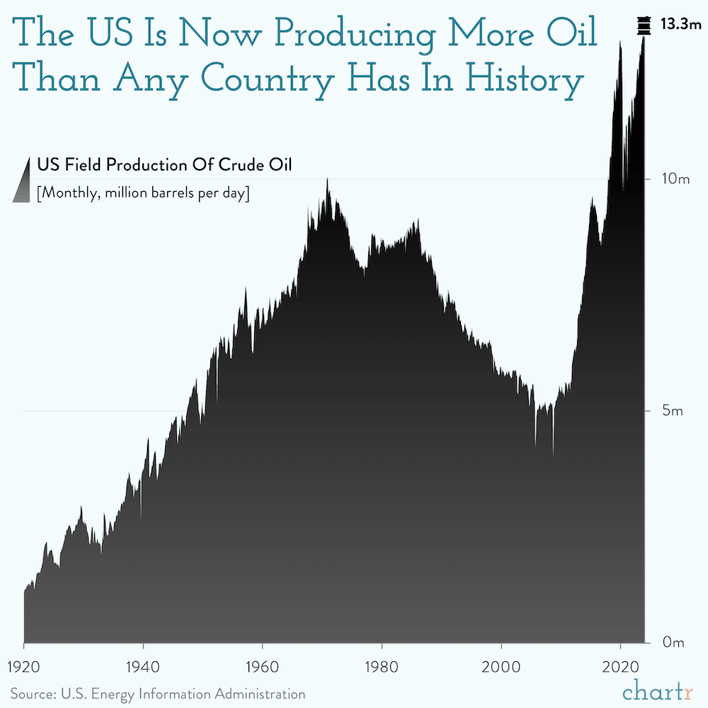 The modern petroleum industry can trace its roots — or wells — back to the 1850s when Edwin Drake dug a ~70 foot oil hole in Pennsylvania and started pumping up to 20 barrels a day of what would come to be known as black gold. But, despite getting a head start on much of the rest of the world, the US was a relatively small player in global oil for much of the 20th century.
