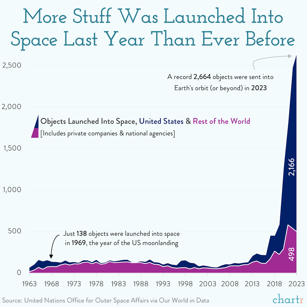 We are launching more stuff into space than ever before. Indeed, us Earth-dwellers launched a record-breaking 2,664 objects into space last year… with the US — be that American companies or government agencies — responsible for 81% of them.