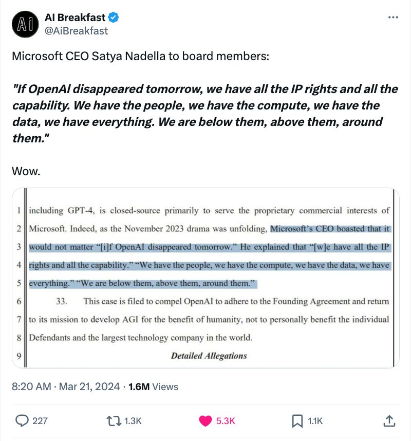 Microsoft isn’t slowing down, and they’re also getting a bit creative.. This deal, mostly in the form of licensing Inflection's AI models, allows the startup to provide a positive return to its investors despite most of its staff joining Microsoft. The unusual arrangement has raised questions about whether it's structured to avoid regulatory scrutiny over potential acquisitions in the AI space.