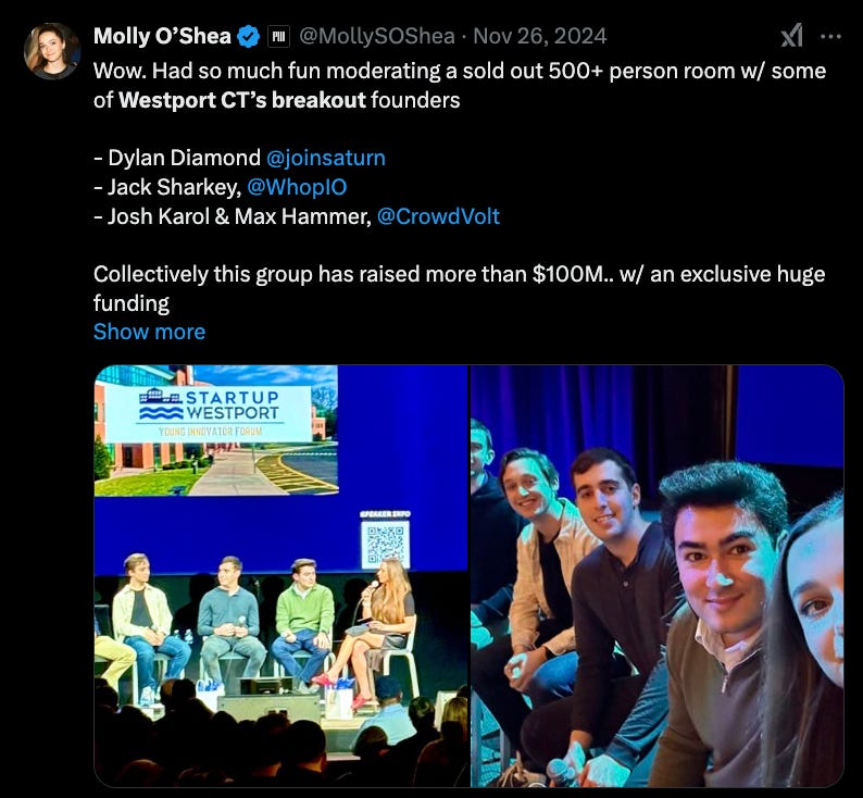 Last November, I had the opportunity to moderate a panel back in my hometown of Westport, CT along with other Staples High School alumnus for Startup Westport. Founders included Dylan Diamond CEO of Saturn, Jack Sharkey CTO of Whop, as well as Josh Karol CTO & Max Hammer CEO of CrowdVolt.